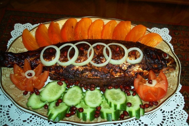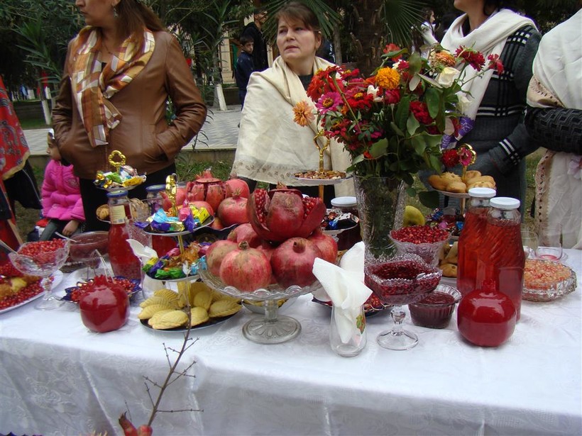 В ноябре созревают и срывать можно с деревьев мандарины, гранаты и хурму. Да и на рынке эти фрукты очень дешевые. В Каспийском море ловят полуметровых осетров. И если вы побывали в Баку, то обязательно попробуйте кутум из осетра. С осетра снимают кожу и потрошат, очищают от костей. Пропускают через мясорубку и добавляют в фарш орехи, курагу и чеснок. Кожу наполняют этим фаршем и ставят в духовку. Подают с огурцами, перцем и помидорами, посыпают зеленым луком и кинзой.