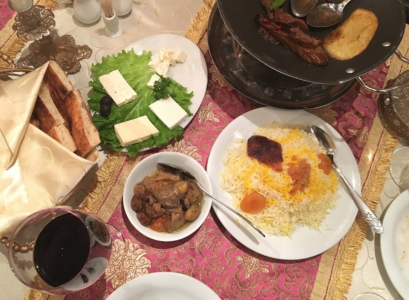 Именно здесь я попробовала несколько видов плова: Сабза-коурма, который делают из баранины, огромного количества зелени и шафрановой настойки; Чий-дошамя-коурма, приготовленный с добавлением баранины, тыквой и каштанами; Ширин — это сладкий плов, который делается из кураги, персиков и алычи.