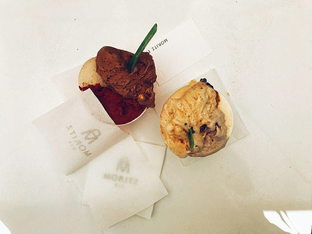 Фишка в том, что мороженое натуральное. А значит полезное и можно лопать сколько влезет. Ну серьезно, когда еще удастся попробовать? Выбрать сложновато, но всегда найдется решение. В данном случае милая девушка дает попробовать любое мороженко, прежде чем заказать с ним рожок. Перепробовать можно абсолютно все - я так и делала. Мы взяли по три шарика каждый. Я люблю сливочное с сыром например, но в этот раз самым необычным стало сочетание земляники и базилика. Я же говорю, очень круто! И кстати Moritz я ем уже третий год, но каждый раз все вкусы разные, они стараются не повторяться.