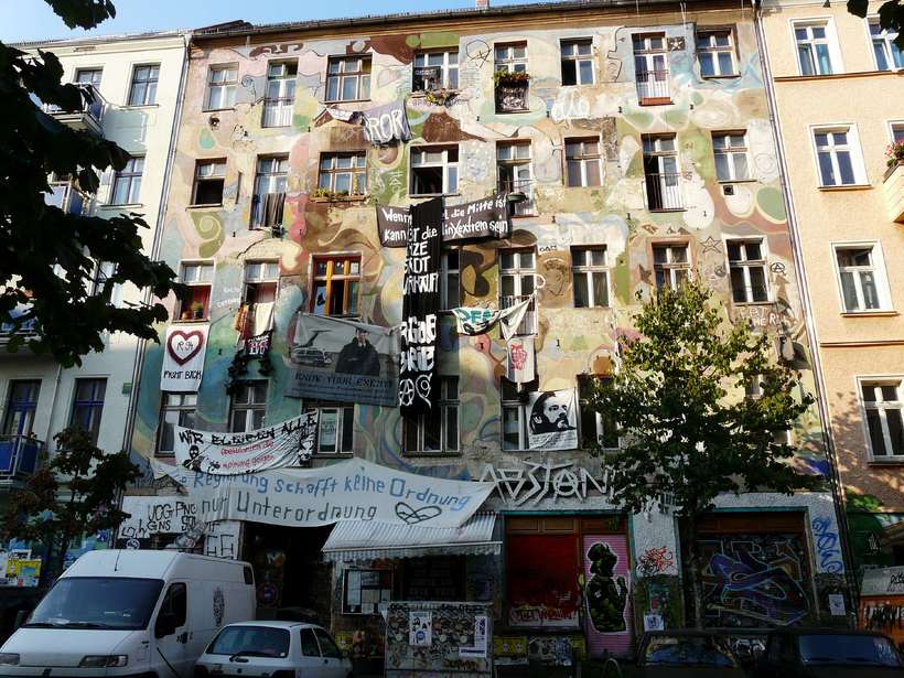 мне больше всего понравился район Friedrichshain, это не далеко от центра, близко несколько веток метро, там много разных баров, арт-центров, парков, отдыхающей молодежи, концертных площадок. Это центр альтернативной молодежи, это место служит часто проведению уличных фестивалей. Для фанатов граффити культуры здесь много разрисованных домов с первого по последний этажах в рисунках. Много домов, захваченных художниками и панками, которые украшают дома баннерами, и разнообразными рисунками