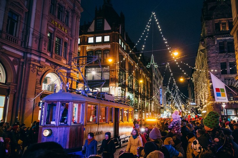 После обеда следующего дня мы целенаправленно выдвинулись в сторону одной из центральных улиц Хельсинки – Алексантеринкату. Занимательное зрелище, которое можно увидеть здесь – прибытие Йоулупукки на музейном трамвайчике. Он зажигает праздничную иллюминацию и поздравляет всех с наступающим Рождеством. В уличных лавках продают вкусную выпечку и наливают горячий глёг. Мы согрелись и вечер пролетел незаметно, были песни, танцы и хорошее настроение нас не покидало.