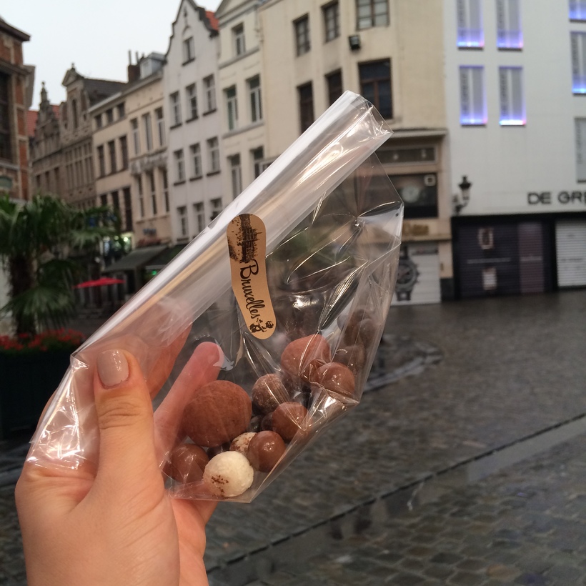 А вот недалеко от "писающего мальчика" можно закупиться фирменным бельгийским шоколадом. Можно взять фирменные конфеты на развес, а можно купить подарочный набор. Моя поездка только начиналась в Бельгии и была очень длительной, поэтому я купила немного конфет на пробу, выглядело это вот так: