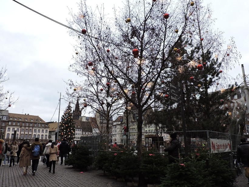 Стеклянные шары и прочие елочные украшения хэнд-мэйд в большом ассортименте были представлены на площади Бройля, а на пл. Клебера стояла пушистая ель, декорированная ангелами и звездами.