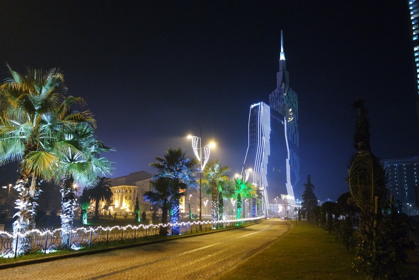 Центр светится огнями. Переливаются, сверкают здания. Устанавливаются различные украшения и фигуры. На площадях Батуми вырастают елки. Свисают отовсюду гирлянды.