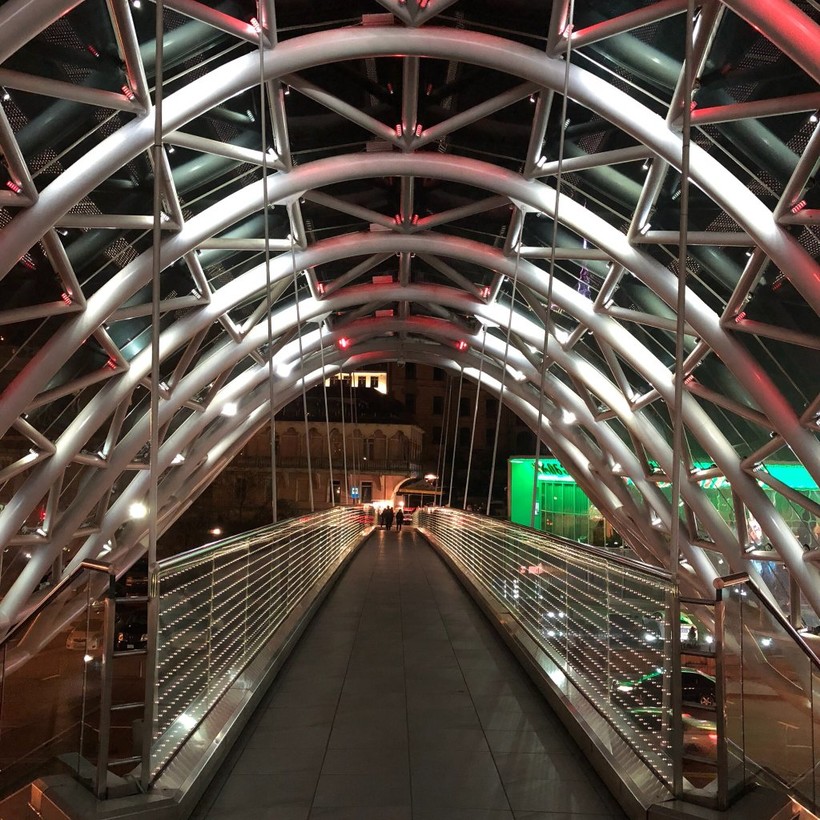 С наступлением темноты загорается подсветка на мосту Мира, который соединяет две части Тбилиси: старую и новую. Из обычной стеклянной конструкции он превращается в волшебный тоннель, пройдя через который можно перенестись на пару веков назад.