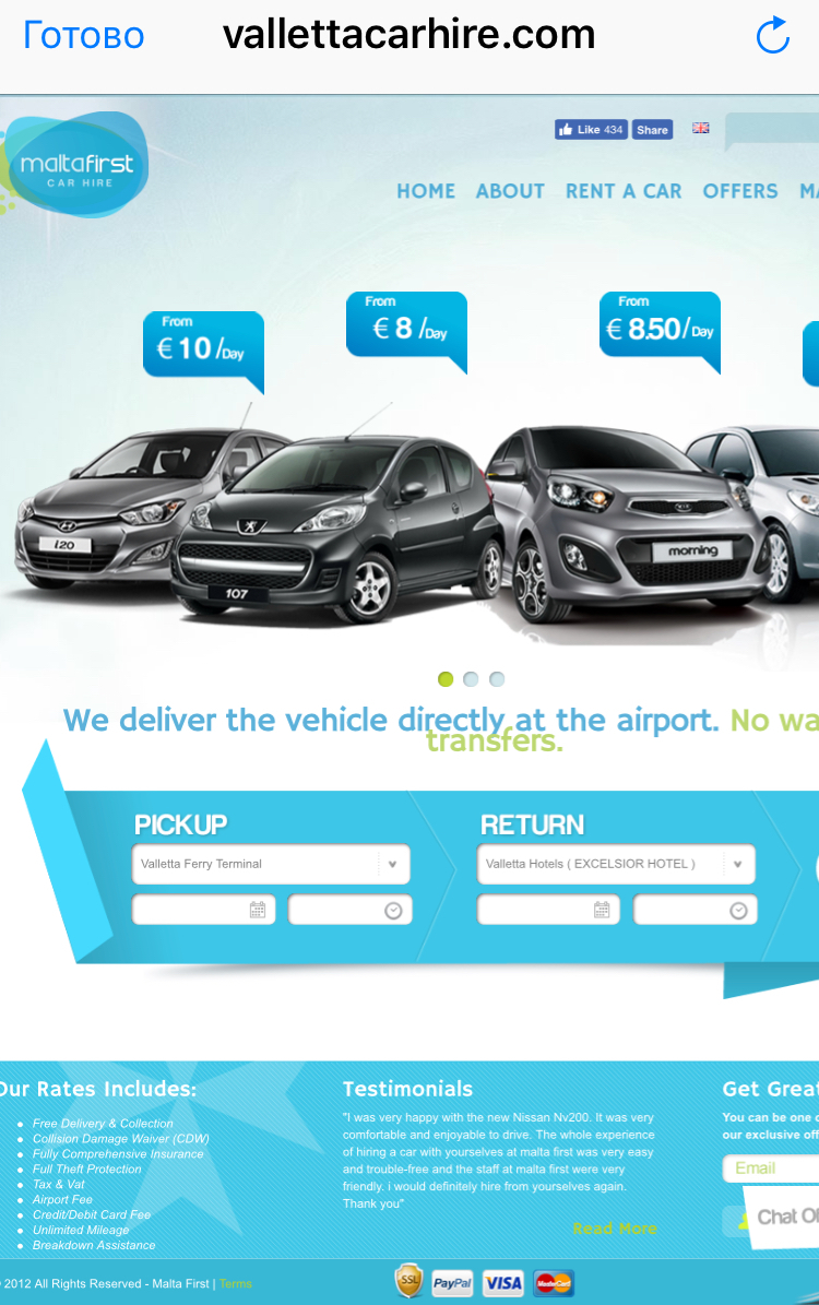 Машина в аренду это определённая свобода выбора мест, времени передвижения и продолжительности нахождения в том или ином месте. Поэтому я всегда двумя руками за аренду авто. Авто в аренду в Валлете можно арендовать в компании vallettacarhire.com. Можно заказать в паромный терминал, а можно прям в отель заказать. Практика аренды с использованием кредитной карты это вполне цивилизованная форма аренды, практикующаяся по всему миру. Если не блокировать депозит на карте то как можно гарантировать что вы оплатили все парковки и не превышали скорость. С помощью замороженных средств все штрафы будут погашены. А если срок блокировки на карте прошёл то штраф вам пришлют по месту жительства . Так выглядит сайт прокатной компании