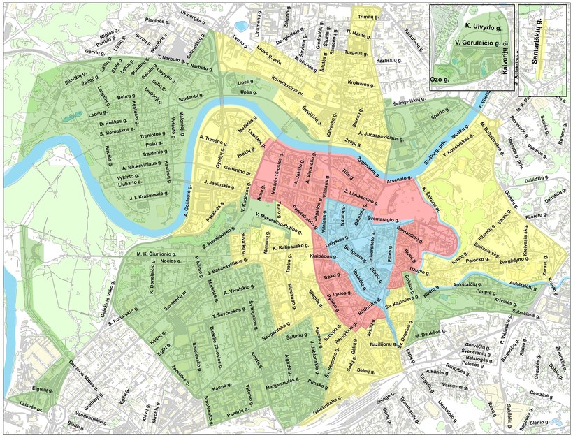 На карте приведены зоны муниципальных парковок Вильнюса.