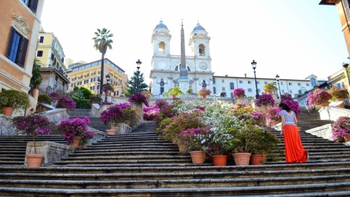 Чем еще хорош апрельский мир - он весь в цветах, даже организована специализированная цветочная выставка. Увидеть красивейшие азалии и розы можно увидеть на Испанской лестнице, украшенной этими цветами со второй половины апреля.
