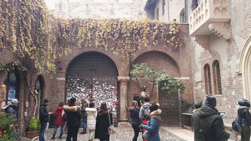Дверь дома Капулетти сверху донизу обклеена бумажками, испещренными письменами. Встречались и русские, привет автору оригинальной записки «Таня + Володя = love».