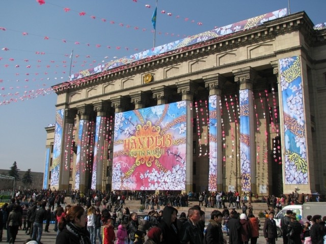 В марте в Алматы масштабно отмечают только один праздник, зато какой! С 21 по 23 марта жители города (как и всей страны) отмечают казахский Новый Год, который символизирует весеннее обновление. Не удивляйтесь такой странной для Нового Года дате – казахи отмечают его по солнечному календарю. Называется он у них Наурыз и отмечают его поистине с размахом. В городских парках и дворцах культуры устраиваются праздничные программы, которые включают в себя патриотичные речи местных политиков и просто влиятельных алматинцев, а также концертную программу с песнями и плясками, часто народными. Но самая масштабная и разнообразная праздничная программа устраивается, конечно же, на главной алматинской площади под названием, как ни странно, «Астана» :) Кроме вполне стандартных танцевальных и вокальных номеров, там можно понаблюдать еще и цирковые выступления и спортивные игры, для которых выделены отдельные зоны со своими сценами. Довольно увлекательно и для взрослых, и для детей. Почти все участники праздника одеты в красивые национальные костюмы, а для детей – аниматоры в нарядах, как мне сказали, персонажей казахских народных сказок.