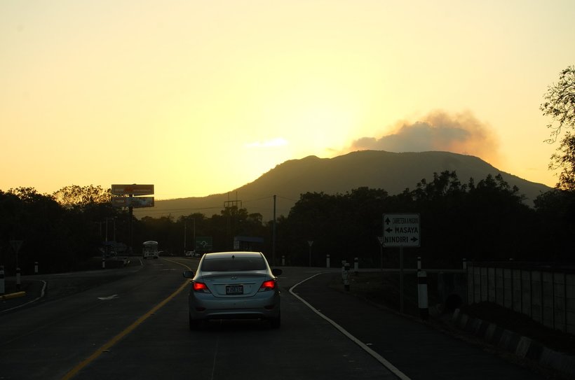 Пока автобус едет до вулкана (около часа езды), можно любоваться на шикарный закат, на фоне которого уже отлично виден дым, поднимающийся от вулкана. Масая - это довольно невысоко расположенный кратер, в дыре которого происходит химический процесс превращения лавы в магму. Он считается одним из самых легкодоступных в стране, высоко карабкаться совсем не надо. Правда из-за постоянной активности вулкана пеший проход к нему закрыт, можно доехать только на туристическим автобусе или в машине смотрителей парка.