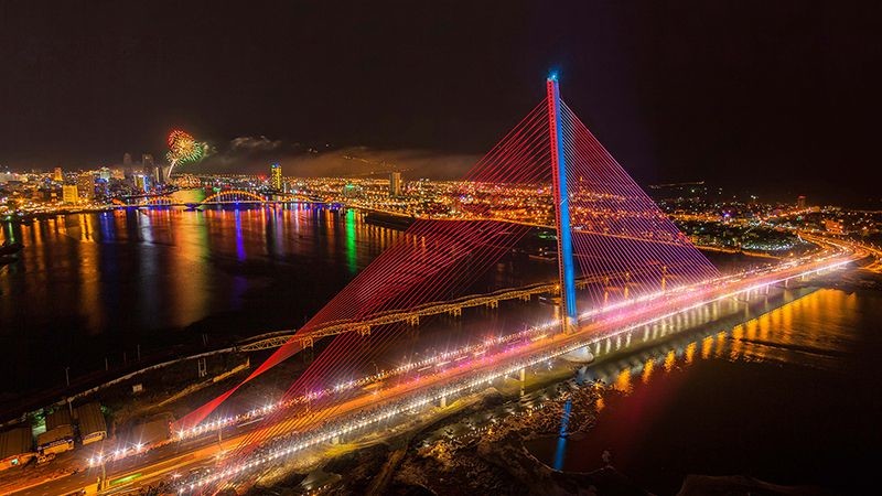 Вторым моим любимым мостом после драконьего является мост-парусник или мост Чан Ти Ли и этот мост видно с драконьего моста, расположен он в 1 км от него. Данный мост выполненный в виде паруса получил несколько международных наград за оригинальный дизайн. Он символизирует стремление города к дальнейшему развитию. Общая длина моста составляет 731 метр, а высота — 145 метров. Далее еще один из моих любимых мостов, мост через реку Хан (Han River Bridge). Он меньше других, но от этого не менее красив! Этот мост уникален тем, что является самым первым разводным мостом во Вьетнаме, представляете? Разводится он так: центральная часть моста разворачивается на 180 градусов, образуя два прохода для лодок и кораблей. Развод мостов осуществляется только по выходным дням в полночь. Во время разведения, к сожалению, мост уже не подсвечивается.