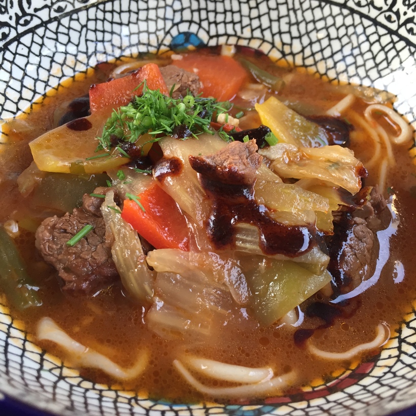Узбекская, грузинская, украинская, русская, арабская кухни. Манты, пельмени, борщ, хачапури, лагман, сырники, хинкали, шашлык, медовик. Это то, что я успела сама попробовать. И это все вкусно! А какой у них чай...! :).