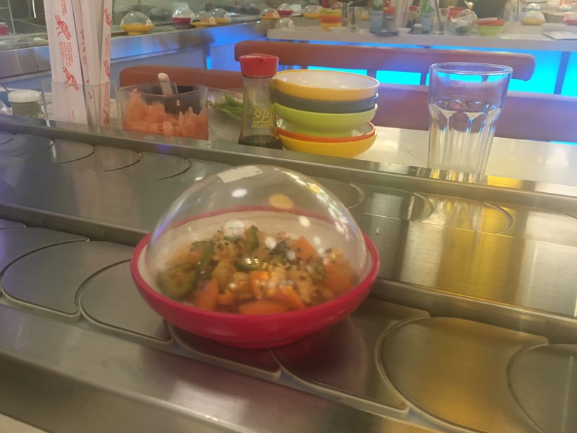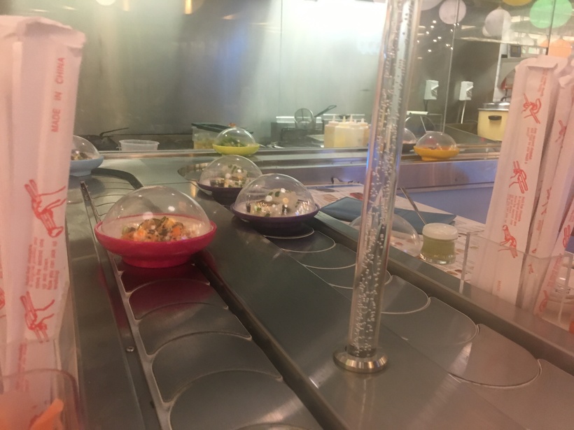 еще одно необычное место нашел в Эмирейтс Молл в ресторанном дворике на втором или третьем этаже. мы между собой назвали это место "суши-карусель". это когда садишься за столик и мимо тебя едут разные суши, в разных по цвету тарелочках. горячее и напитки можно заказать отдельно. обязательно изучите меню и стоимость тарелочек. разные цвета- разная стоимость. вроде сначала смотришь и не кажется что дорого, а потом когда они постоянно едут мимо, все время себе что-то схватишь и на круг получается дороговато. на фото как это все выглядит.