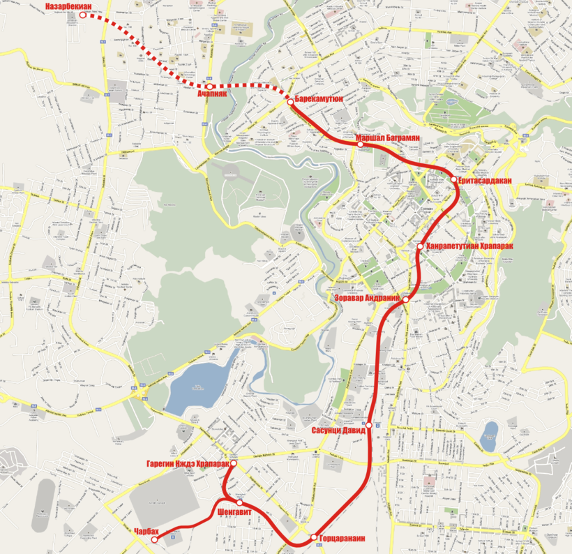 На данный момент, ереванское метро насчитывает всего 10 станций. Строительство заморожено, и многие ветки до сих пор не достроены. Запутаться в метро в Ереване просто невозможно, так как тут только одна линия, соединяющая станции Барекамутюн (Дружба), Маршал Баграмян, Еритасардакан, Площадь Республики, Зоравар Андраник, Сасунци Давид, Горцаранаин, Шенгавит, Гарегин Нжде и Чарбах.