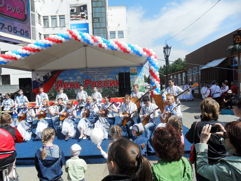 В июне во всей стране один главный праздник – День России. Вот на него я и попала в Челябинске. В городе было много разных мероприятий в разных районах. Но мы с подругой пошли на Кировку погулять. Кировка – это пешеходная улица, как Арбат в Москве. Там была устроена сцена, концерт шел силами артистов больших и малых челябинских театров. Пели вполне прилично. Детки выступали: пели - плясали. Народ тусовался всякий, разновозрастной и разносоциальный. На Кировке много небольших скульптур, так в праздник к ним не подойти, очередь, чтобы сделать фото. Сувениров много продается из уральских камней и не только.