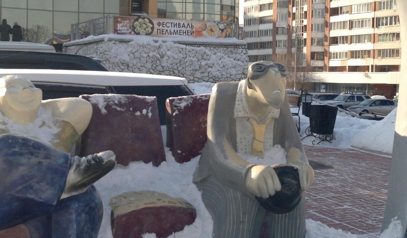 1 января выбрались в город, побывали на елке у кинотеатра Звездный. Тамошняя скульптура «Киноманы» привела в неописуемый восторг.