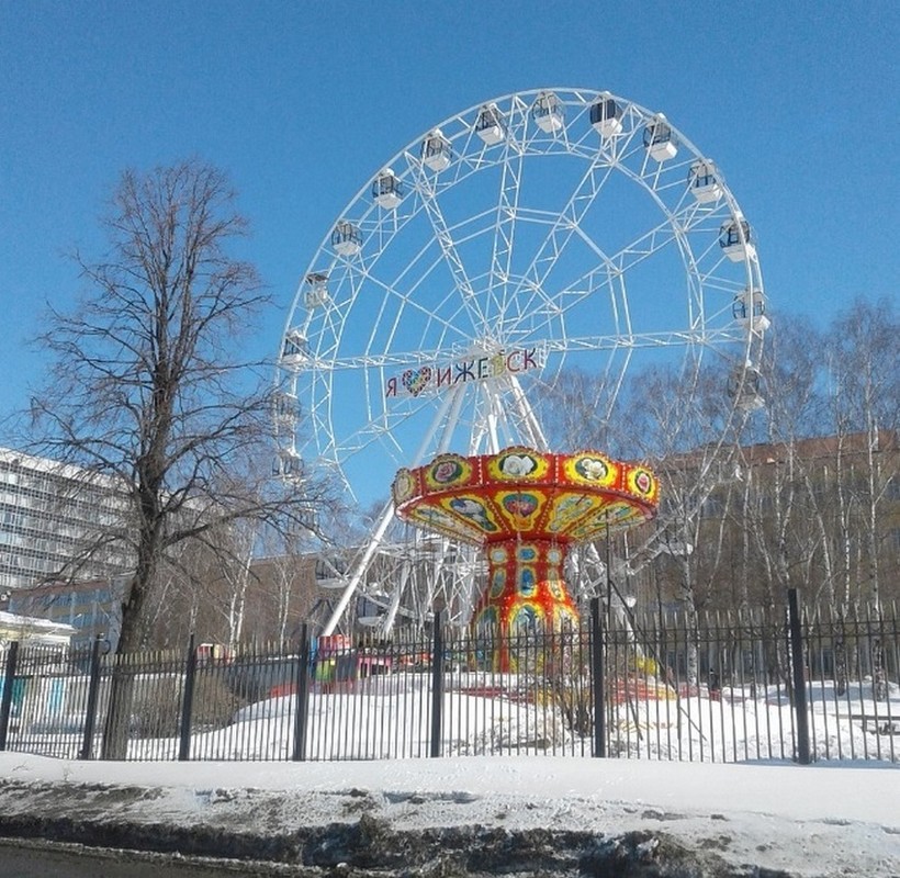 Потом, озаботившись тем, что мартовского-то Ижевска практически не лицезрел, забрел в местный ЦПКиО им. Горького. Прекрасно погулял по расчищенным дорожкам. Жаль, колесо обозрения не эксплуатировалось по причине низких температур (–10).