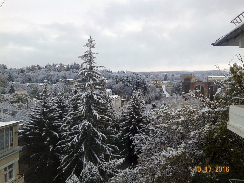 Спустя неделю погода преподнесла неожиданный сюрприз: выпавший снег запорошил крыши домов, деревья с неопавшими зелеными листьями. Но ненадолго. Следующим же утром установилась тихая осенняя погода, ничем не напоминавшая о вчерашних осадках. Она простояла до конца моего пребывания в Кисловодске.