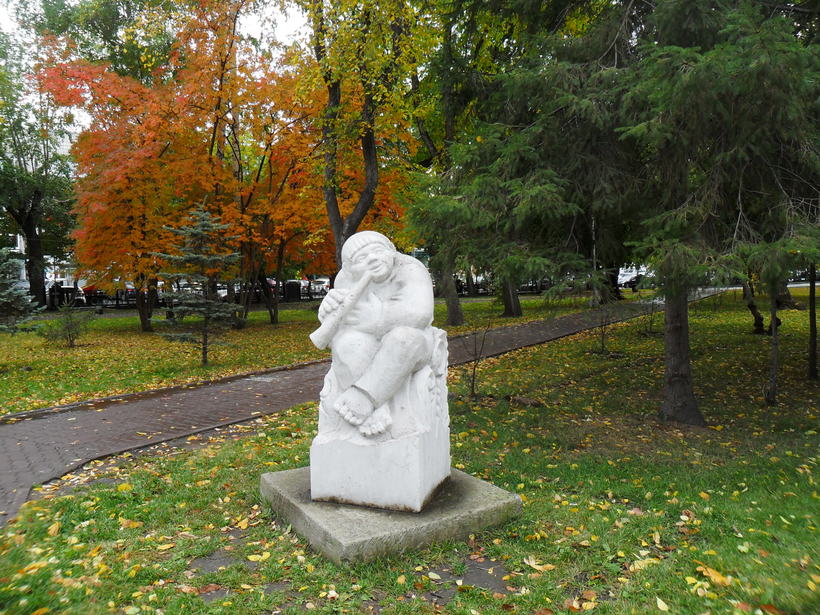 И как бы тепло не было, гулять приходилось в легкой куртке или плаще, еще и с зонтом на «пожарный случай». Ночью всегда прохладней, чем днем. Бывало, что всю ночь шел дождь, а днем выглядывало солнце, и был яркий и теплый день. Были и пасмурные дни. Вот в такой из дней пошли с ней гулять по центру города, памятники миниатюрные фотографировать,