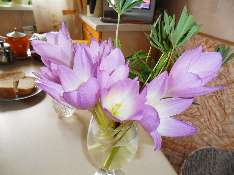 В Новосибирске в сентябре в садах уже собран практически весь урожай и картошка выкопана. У подруги на балконе дозревали зеленые помидоры, и лежала куча здоровенных кабачков. На рынках продавали в основном привозные овощи и фрукты, всего было много, но цены дороже, чем у нас в оренбуржье. Из местного на мини рынках или у станций метро и на автобусных остановках продавали кедровые шишки или орехи. Дорого. Но пришлось купить пару шишек, как сувенир, для внука. Еще меня удивили какие-то необыкновенные цветочки, они повылезали во дворах многоэтажек, такие нежно-сиреневые, похожие на колокольчики, но совсем без листьев. Муж подруги привез ей букетик этой красоты с дачи.