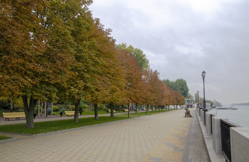 В замечательном, на мой взгляд, городе Ростов-на-Дону, городе воинской славы я учусь вот уже третий год, и за все время я старалась не упустить возможности совершить хоть недолгую прогулку по самым красивым и популярным среди населения и туристов местам. Экскурсию по городу, пусть и самостоятельно организованную, нужно провести как минимум одну в сезон, ведь город предстает по-разному в разные времена года. Ноябрьский Ростов очень изменчив. Если в первых числах месяца еще можно наблюдать золотые ковры из листьев, довольно комфортную для прогулок температуру, иногда переваливающую за +10, то после числа 15-го жителей и гостей ожидает либо тот самый холодный ветер с дождем, который, как ему и пророчилось в песне, усилился стократно, если сравнивать буквально с неделей ранее, либо не совсем понятные осадки (то ли снег, то ли дождь, то ли микс). Совсем же в завершении месяца нередко встречается мокрый снег, который, увы, вместо пушистых обочин созидает мокрые улицы с кучей смеси из этого самого снега и грязи, которая того и гляди запачкает Вам штаны и промочит обувь. Интересно, что особенно дождлив Ростов в ноябре, если в первых двух осенних месяцах осадков практически не было. Отыгрывается, видимо. Нередко приходилось наблюдать и одно- и двухдневные морозы, которые неожиданно бьют по еще вчера мокрой кашице, которая сегодня уже превратилась в ледники. Минус бывает в ноябре редко, но, что говорится, метко. Так что рекомендую и шарф теплый с шапкой с собой иметь, дабы уши и нос укутать, и пуховик водоотталкивающий, чтоб в зимнем пальто не промокнуть насквозь. А вот солнце в ноябре застать невозможно практически, до зимы оно прячется, пока серые тучи наводят на жителей тоску. Кстати, насчет тоски, да и вообще влияния туч: заметила, что слишком многие жалуются на скачки давления именно в ноябре, да и я не исключение. Вечные темные дни, перепады температуры - все это очень влияет на физическое и психическое состояние.
