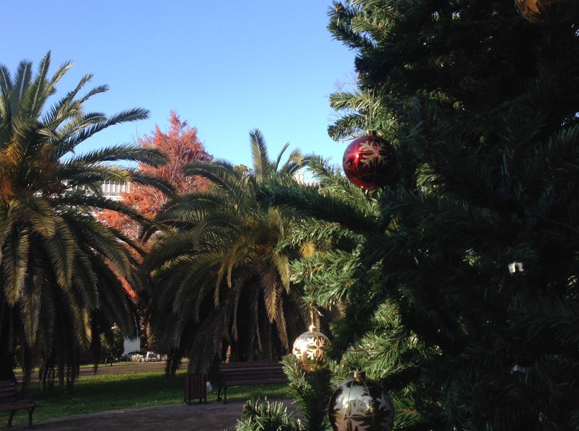 Радует то, что вокруг совсем не чувствуется зимы. Зеленеют пальмы и газоны, местами что-то цветет. У было ощущение, что я приехала в весну - в самом середине декабря, но от этого не менее реальную. Сочинский декабрь запомнился мне крепким ароматом морской соли и ярким мандариновым вкусом.