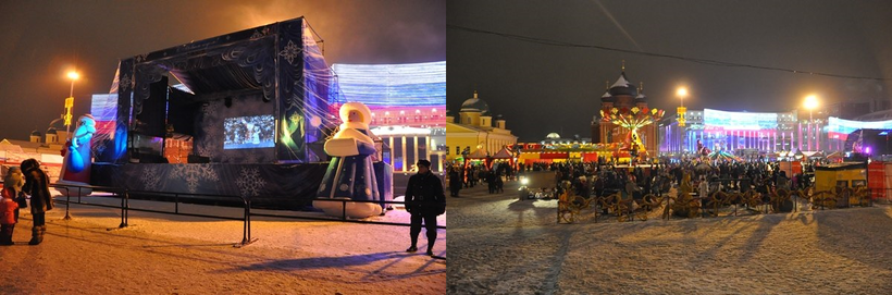 А вот зимний кинотеатр также работает в новогодние каникулы в Туле, на площадь Ленина можно прийти и посмотреть на фильмы под открытым небом. Очень романтично, сюда и девушку сводить можно. Только единственный минус всего это действа заключается в том, что звук слышно не очень хорошо за счет проезжающих мимо машин, да и находиться час с лишним на холоде - не очень.
