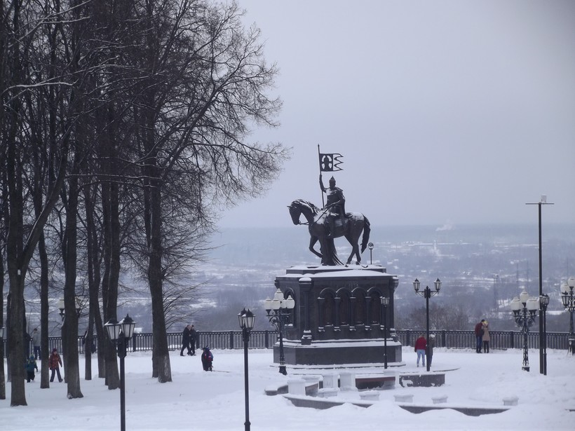 После обеда я и моя девушка, пошли осматривать достопримечательности города. Я видел всё тысячу раз, но Оля была во Владимире впервые. Да и мне хотелось прогуляться по снежному городу. Первым делом мы пошли на смотровую площадку. Судя по тому, что на ней толпился народ, можно сделать вывод, что зимой в новогодние и рождественские праздники есть туристический наплыв. Но все равно приезжих в январе здесь меньше, чем летом.