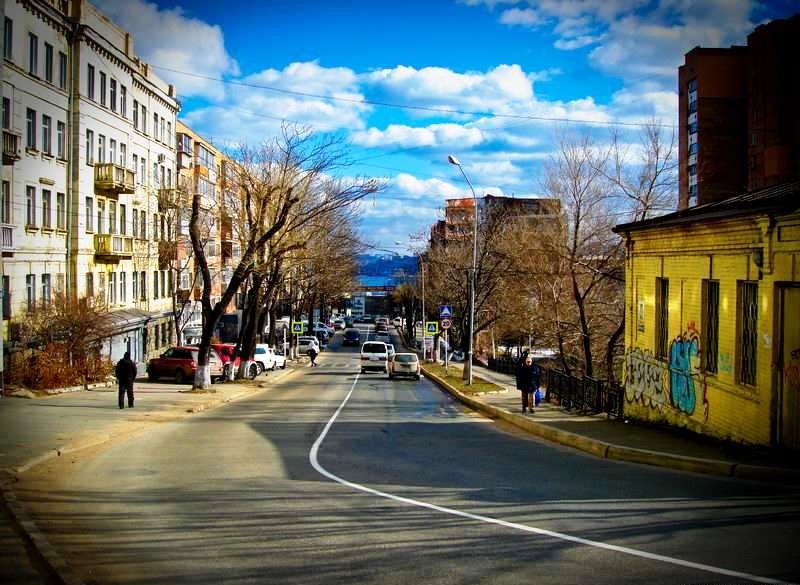 Владивосток мы посетили в начале марта, в ходе путешествия по Трансибу. Климат там муссонный, зимой ветер дует в сторону океана и сдувает весь снег. Сколько гуляли по городу - снега или вообще не было, или совсем мало виднелось. По утрам очень красиво смотрелись сопки в белесой дымке, которые можно было увидеть на горизонте. Вообще погодка была чудная, мы на такую и не надеялись. При легком морозце в -3...-5С светило яркое солнце, придавая городу немного праздничный вид. Для посещения Владивостока нам было достаточно обычного пуховика и зимних ботинок. Никаких тулупов на овчине и валенок не понадобилось:)