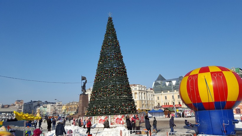 Красавица-елка расположилась на Центральной площади. Здесь же залили ледовый каток и организовали рождественский базар с сувенирами, новогодними украшениями, елочными игрушками и лакомствами.