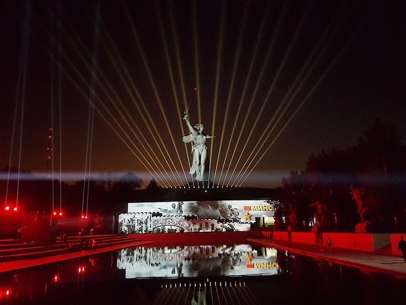 Представление называлось «Свет великой победы». С помощью лазерных лучей на подпорной стене памятника «Героям Сталинградской битвы» показали историю городов-героев России.