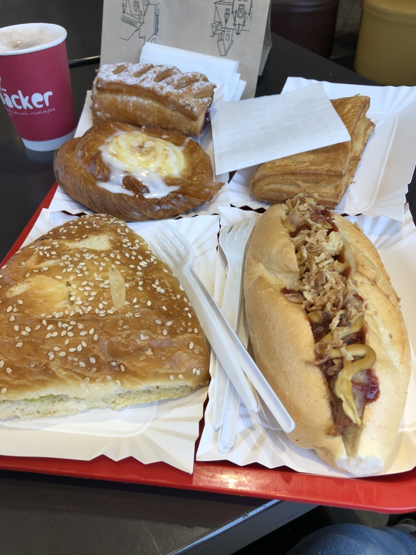 Ещё удивило, что привычных нам Макдоналдс и KFC практически нет, во всем городе видела всего два KFC и один Макдак. Зато есть очень вкусная пекарня Konigsbacker, там выпечка просто нереальная. У них после 7 вечера скидка на всю продукцию, так там в это время огромные очереди. Но без скидки цены тоже кусаются, конечно. За три булочки, хот-дог и какао у нас вышло 600 с чем-то рублей. Но было очень вкусно все.