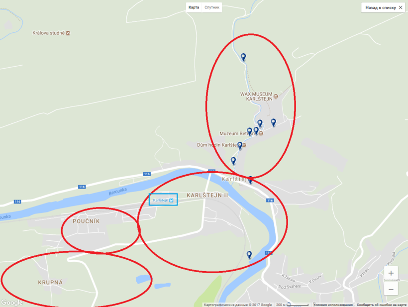 Карлштейн, расположившийся по двум берегам реки Берунка, невелик и застроен в основном двухэтажными домиками. Деление на районы здесь весьма условно, Но я бы выделила район, «Карлштейн II», находящийся к югу от реки, рядом с ж/д станцией, и, пожалуй, самый главный – район замка Карлштейн вверх от реки Берунка, расположенный буквально в пяти минутах ходьбы от главной достопримечательности. Именно в этом районе сосредоточены все основные отели и ресторанчики. здесь всегда много туристов, довольно большое количество сувенирных лавок и магазинов, ну и вообще это достаточно интересное место. Поэтому мне кажется, выбор данного района в качестве краткосрочного местопребывания наиболее оптимален и весьма логичен.
