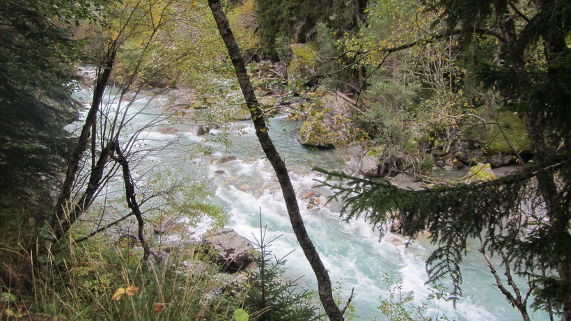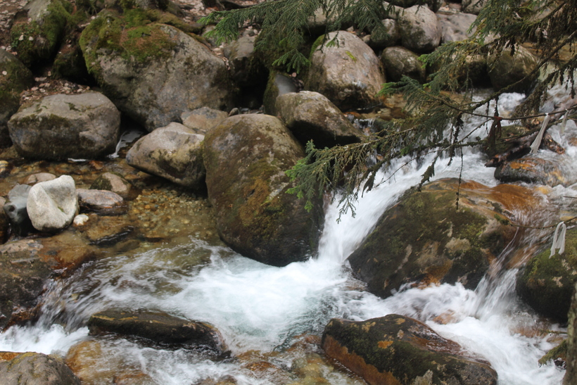Ущелье уже в начале необычайно живописно - скалы, поросшие мхом; огромные валуны; высокие пихты и сосны; чистейшая, бирюзовая вода горной реки... Те, кто едет на автомобиле, обычно не успевают разглядеть все красоты - с дороги их видно не так хорошо. Так что, почаще делайте остановки.