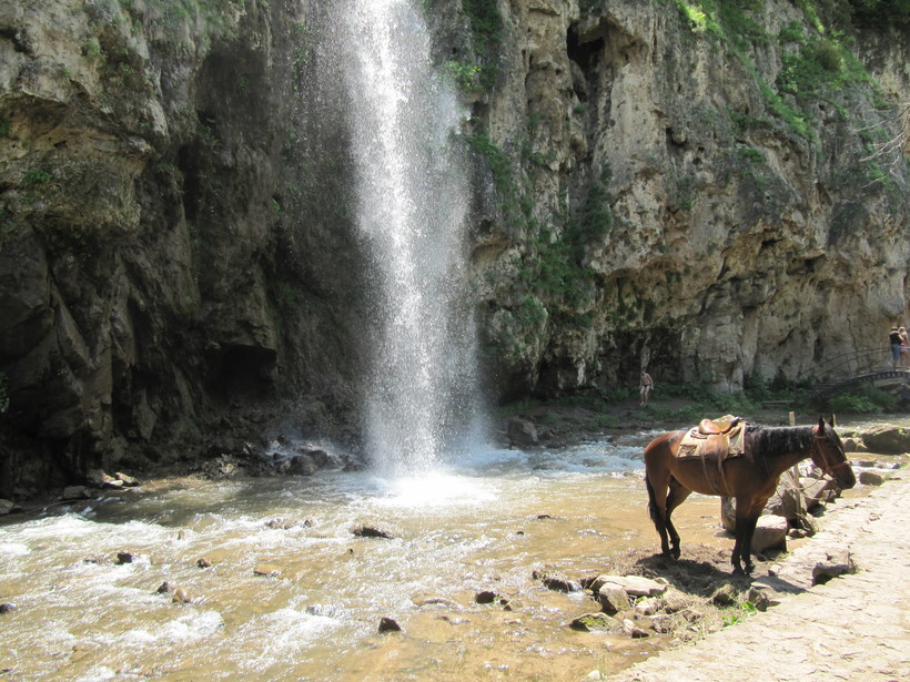 Вы возвращаетесь к Кисловодску и поворачиваете в сторону Домбая. Вы же еще не забыли дорогу? Как только проезжаете вывеску «Карачаево-Черкесская республика» , делаете первый поворот налево и никуда дальше не уходя с главной дороги, едите на Медовые водопады. «В это место нужно доехать, даже если у тебя всего один день в Кисловодске» Именно такие слова, я услышала за 2500 км от Медовых водопадов. В зависимости от Вашего физического состояния спускаться к водопадам можно с двух сторон: через довольно крутые ступеньки между скал или через сам комплекс. Тем, кто впервые на Медовых водопадах рекомендую спускаться по крутым ступенькам, ради эмоции встречи с водопадами. Спускаетесь по этим ступенькам , слышите нарастающий гул падающей воды и перед Вами первый водопад -Жемчужный. Группу Медовых водопадов образуют 5 водопадов, из них 3 (Жемчужный, Скрытый и Шумный, или Чёртова мельница) находятся на реке Аликоновке, глубоким каньоном прорезающей скалистый хребет Северного Кавказа, а ещё 2 (Большой и Малый Медовые) — на речке Эчки-Баш (Козья голова), падающей в Аликоновку с высоты 18 м. Самый высокий из всей группы — Большой Медовый водопад (18 м), а самым мощным считается Жемчужный. На стандартной экскурсии туристы видят только 4 водопада. Малый Медовый, можно разглядеть, лишь поднявшись на крутой правый берег Аликоновки. Прячась в зарослях, плотно приникая к каменистому ложу, он плавно скатывается по отполированному лотку, как бы втайне давая разгон водам речки (Козья голова) Эчки-Баш, падающей с высоко обрыва в Аликоновку. Созерцание Большого Медового водопада доставит Вам немало приятных минут. Фото рядом с ним в любое время года великолепны. Летом под его струями можно искупаться, лучшего массажиста, который разобьет малейшие узелки на Вашей спине, Вы не найдете. Часто можно видеть, как те, кто купаются под струями этого водопада, замирают на секунду перед заходом в воду- в этот момент просят у этой живой воды сил, здоровья. Зимой разлетающиеся струйки, замерзая на стене ущелья, образуют причудливые ледяные наплывы и натеки. Название водопадов происходит от местной легенды, гласящей, что в древности в скалах возле водопадов гнездились пчёлы. На территории комплекса есть гостиница, ресторан, кафе национальной кухни, этнографический музей. Дети будут в восторге от возможности покормить животных в Карачаевском подворье. Уехать с Медовых водопадов и не поесть вкуснейшего шашлыка-преступление перед самим собой. Порция на одного конечно немаленькая, но это так вкусно, что лучше берите 3 шампура на двоих, не пожалеете. Великолепные хычины, соленья, сыр. Не забудьте айран, шашлык очень жирный и айран поможет пищеварению. Да, если Вы не за рулем, то попробуйте местное домашнее белое вино. И не забудьте наш местный лимонад «Грушу» с лисенком на этикетке. Чуть выше комплекса можно покататься на лошадях, сувениры также не забудьте. Дети, кстати, обожают фото в национальном костюме на фоне водопадов, стоит на Ваш фотоаппарат всего 100 рублей.