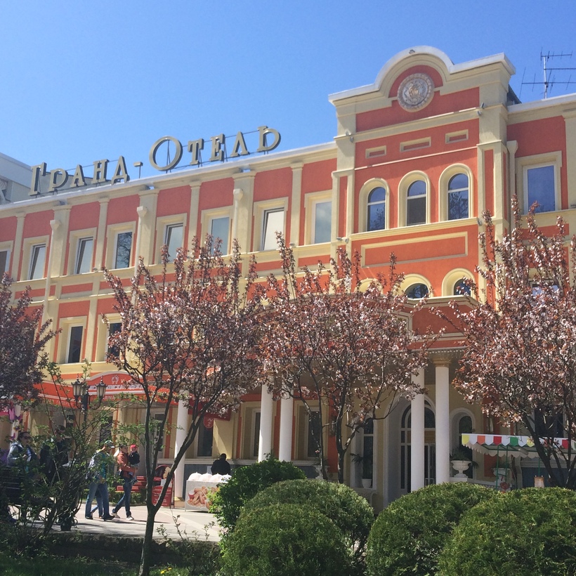 Почти всю половину солнечной стороны улицы К. Маркса занимает многоэтажное и протяженное светлое здание, которое западным фасадом выходит на «пятачок» в начале Курортного бульвара. Это огромное здание является бывшей казенной гостиницей «Гранд-отель». После обзорной поездки по курортным местам Западной Европы министр земледелия и государственных имуществ А. С. Ермолов в своем докладе в 1898 году указывал, что даже европейские курорты имеют комфортабельные «Гранд-отели» со сравнительно умеренными ценами, а на КМВ таких гостиниц пока нет.