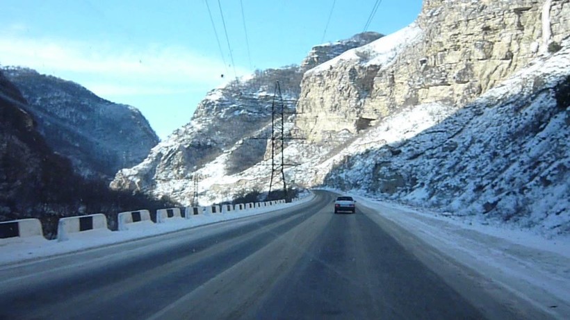 Конкретно нужно попасть в посёлок Терскол, он располагается у подножья Эльбруса. До него 190 километров. Дорога занимает у меня немногим больше трех часов. Если будете посещать этот курорт в зимнее время, то даже и не думайте ехать на летней резине.