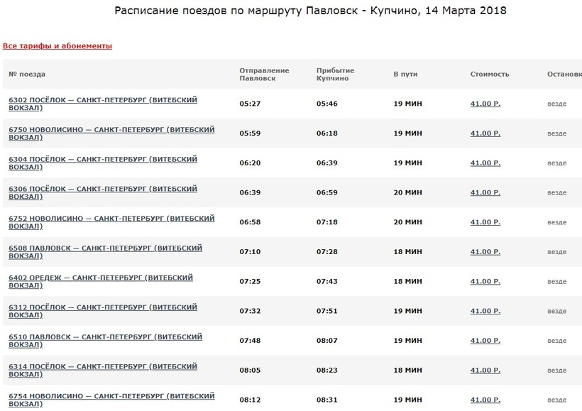 В Павловске, вдалеке от центра и дворца, есть железнодорожный вокзал, через который постоянно ездят электрички в Питер и в Купчино, соответственно. Чтобы узнать расписание, достаточно перейти на сайт РЖД, причем не на главный, а лучше на сайт дирекции, вот сюда.