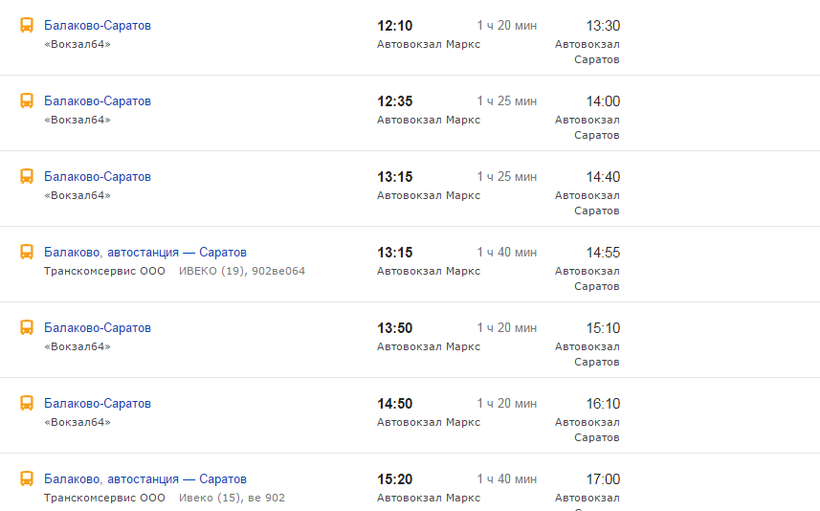Очень хорошо налажено автобусное сообщение по этому маршруту. Первый рейс с Марксовского автовокзала отправляется уже в 06:30, последний – в 20:11. На автобусе проедете до Саратова от 1 до 2 часов. Рейсов между нужными нам городами много, ходят они с интервалом от 10 минут до 1 часа. Днем их намного больше, чем вечером. Привожу ниже небольшую часть расписания автобусов из Маркса в Саратов, чтобы вы могли представить, с какой частотой они ездят.