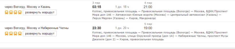 С поездками на междугородних автобусах в эти города очень странное дело. Прямого рейса из Котласа в Киров нет (а обратно есть и идет он всего 8 часов), а чтобы туда добраться из Котласа, потребуется 2 дня. Ехать при этом придется через Вологду, Москву и Казань (или Набережные Челны, как повезет). И все это удовольствие обойдется вам в приличную сумму.