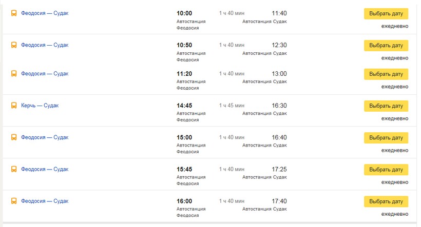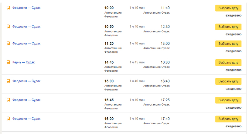 Ниже приведена информация о том, сколько часов вам потребуется, чтобы добраться от Феодосии до Судака, а также приведена примерная стоимость проезда (средняя цена билета) на том или ином виде транспорта.