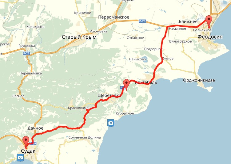 Расстояние между Феодосией и Судаком составляет 37 километров или 23 мили по прямой и 52 километра или 32 мили по автодорогам.