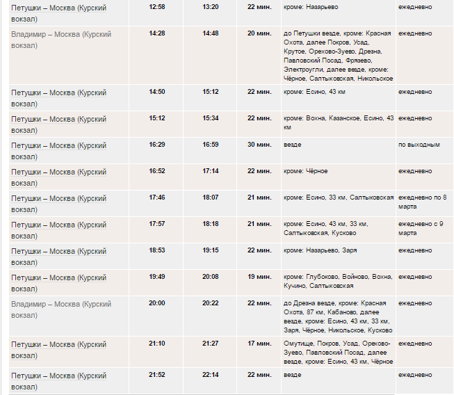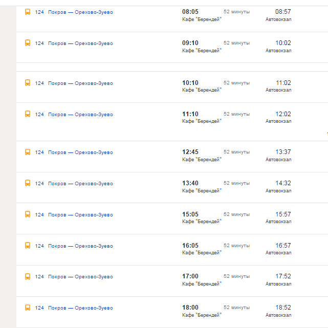 В отличии от электричек, автобусы из Покрова в Орехово-Зуево отправляются с большими интервалами, а время в пути возрастает вдвое.