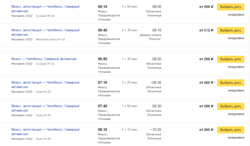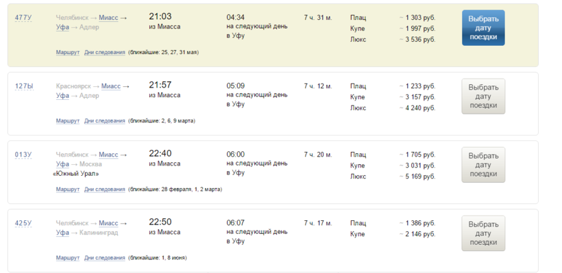 Ниже приведена информация о том, сколько часов вам потребуется, чтобы добраться от Миасса до Уфы, а также приведена примерная стоимость проезда (средняя цена билета) на том или ином виде транспорта.