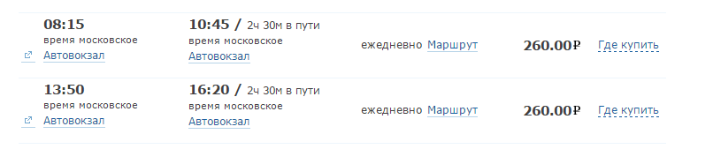 Между городами ходит два ежедневных автобуса (отправляются в 08:15 и 13:50). Едут они до места назначения 2 часа 30 минут, билет же покупается за 250 рублей.