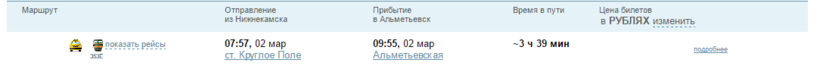 Ниже приведена информация о том, сколько часов вам потребуется, чтобы добраться от Нижнекамска до Альметьевска, а также приведена примерная стоимость проезда (средняя цена билета) на том или ином виде транспорта.