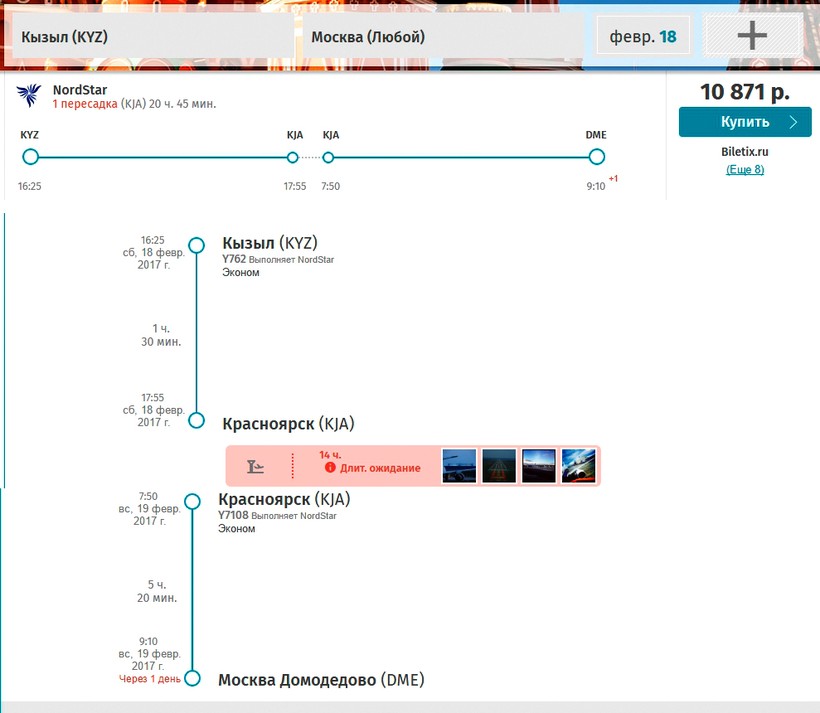 Аэропорт Кызыла небольшой, обслуживает только внутренние рейсы. Ежедневно летают самолеты в Красноярск, Новосибирск, Иркутск, поэтому в Москву можно долететь только с пересадкой в этих городах. Вариаций очень много, можно выбрать исходя из своих возможностей и по времени и по цене. Вот, например, один вариант дешевле, но с длительной пересадкой – 14 часов ожидания в аэропорту Красноярска.