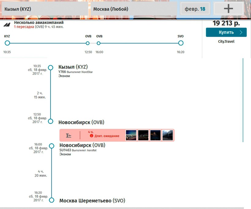 На втором скриншоте время пересадки - 4 часа в Новосибирске, но цена уже 19 213 рублей.