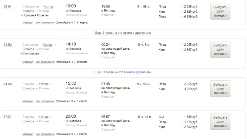 Из Котласа в Вологду ходит несколько поездов, некоторые ходят каждый день, остальные раз в 3-4 дня. Поезд идет до места назначения около 10 часов.